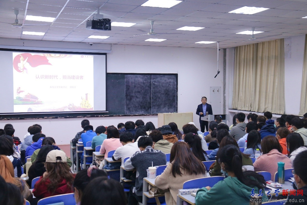 新闻网讯 10月24日上午,校党委书记胡金焱在浮山校区博学楼101教室以“认识新时代,担当建设者”为题,为2019级临床医学150余名本科生讲授《形势与政策》课。