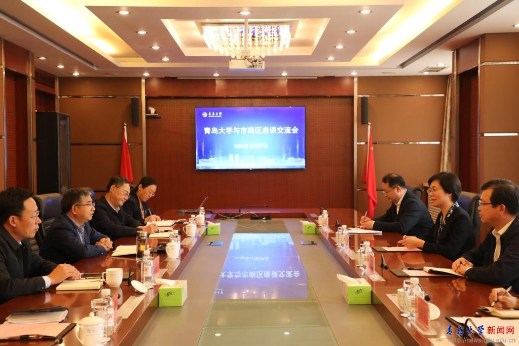 赵燕介绍了目前市南区发展的特点,期待在金融、环境精细化管理、老城区更新改造、基础教育、医疗资源合作等方面与学校进行深入合作。