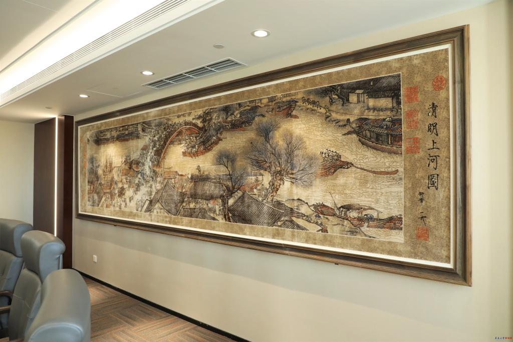 由东方地毯集团有限公司设计出品的“清明上河图”大型艺术挂毯,展现的是宋代绘画大师张择端原创《清明上河图》中北宋都城汴京的繁荣城市面貌和当时社会各阶层人民的生活状况。原画作绘有人物500余人、牲畜60多匹、木船二十多只、房屋楼阁30多栋、推车乘轿20多件等场景。此次受赠的两幅挂毯一幅悬挂于校图书馆二楼大厅,另外一副悬挂于校会议中心301会议室。