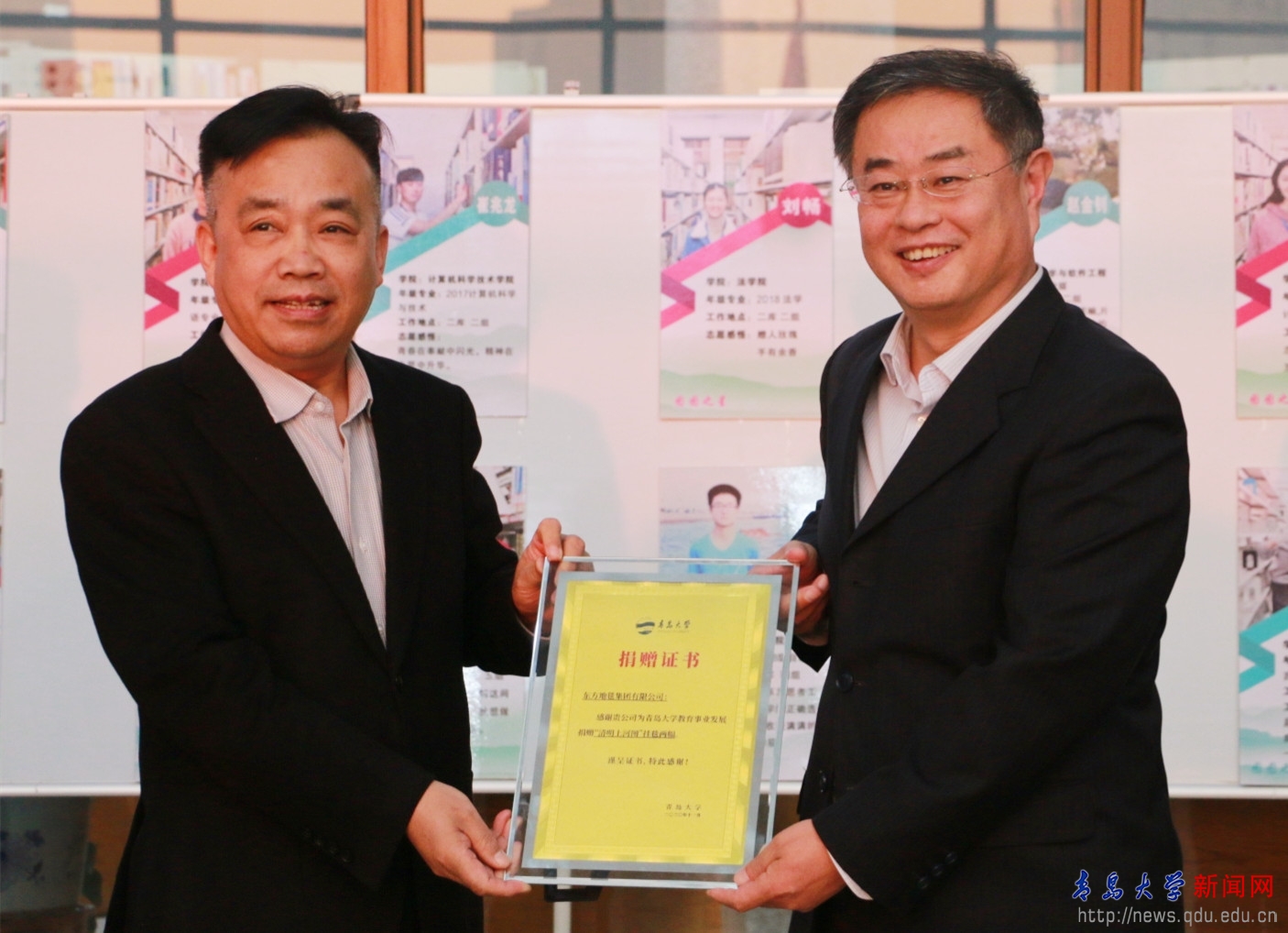 仪式上,夏东伟代表学校向东方地毯集团有限公司颁发捐赠证书。韩洪亮简要介绍了集团有关情况并表达了支持学校和图书馆传统文化建设的愿望。