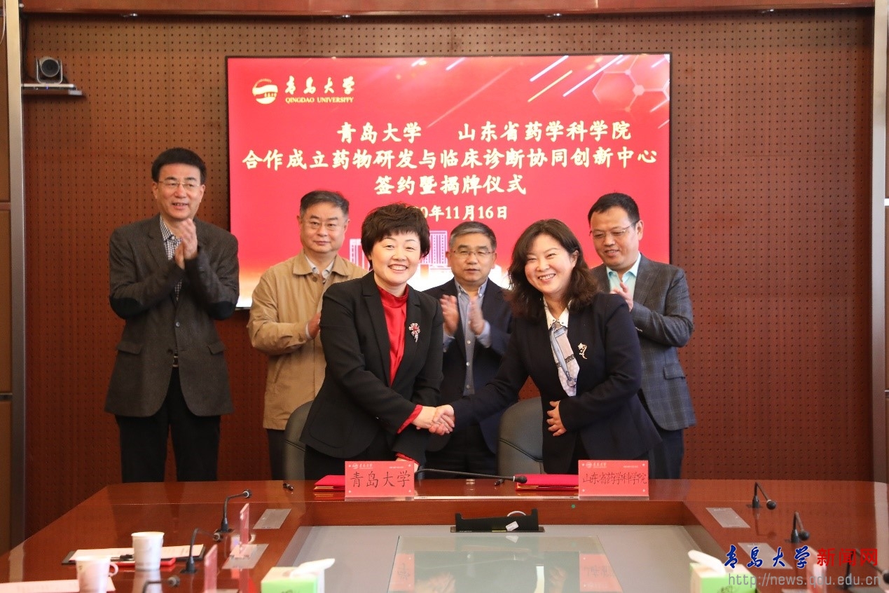 在胡金焱、刘守亮、夏东伟、医学部党工委书记、附属医院党委书记王新生的见证下,医学部部长姜宏和张岱州分别代表双方签署《金年金字招牌诚信至上与山东省药学科学院合作成立药物研发与临床诊断协同创新中心合作协议》。