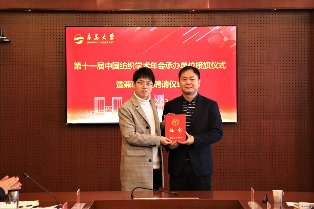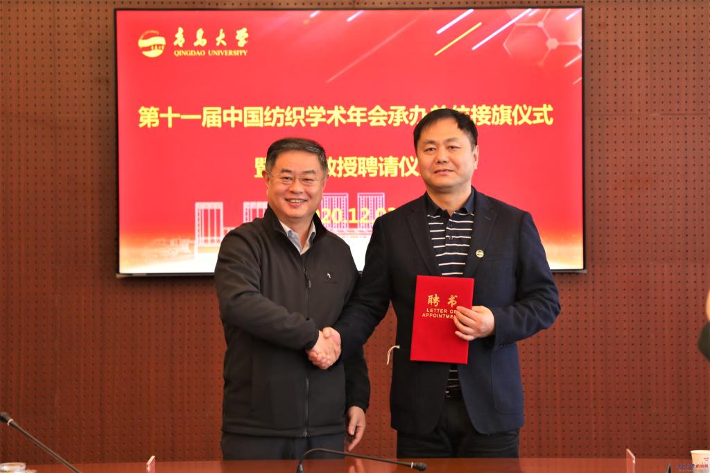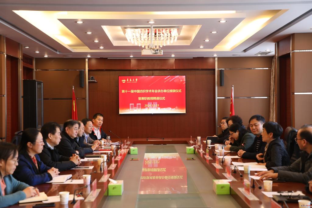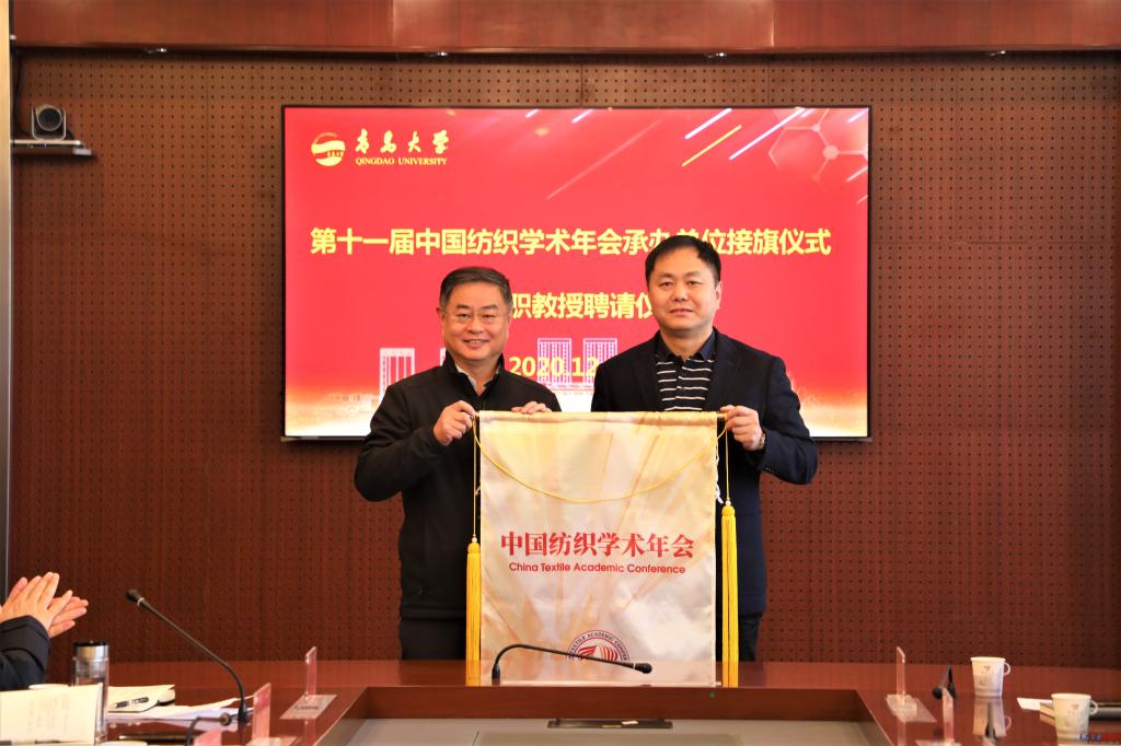 新闻网讯 12月3日,第十一届中国纺织学术年会承办单位接旗仪式在金年金办公楼第五会议室举行。中国纺织工程学会理事长伏广伟、金年金字招牌诚信至上校长夏东伟出席接旗仪式。仪式由中国纺织工程学会副理事长尹耐冬主持。夏东伟代表学校从伏广伟手中接过中国纺织学术年会旗帜,纺织学术年会的“青大时间”正式开启。