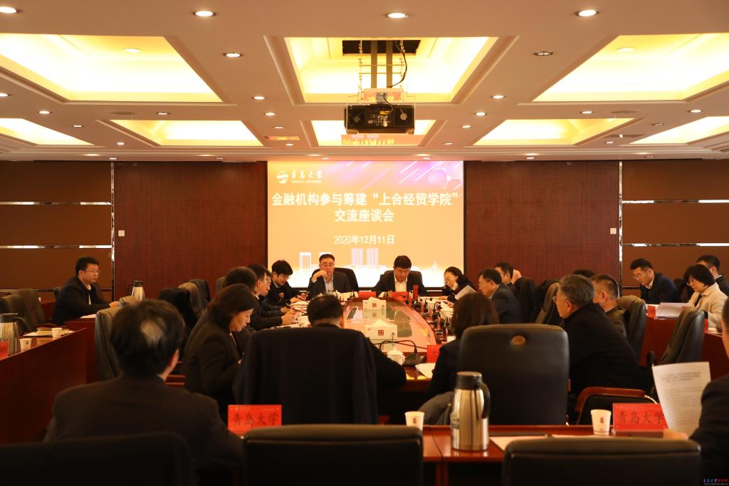 新闻网讯 12月11日上午,金融机构参与筹建“上合经贸学院”交流座谈会在学校行政楼第一会议室举行。上合示范区党工委委员、管委会副主任、上合经贸学院推进工作领导小组副组长孟庆胜,青岛市教育局总督学尹明琴,青岛市地方金融监管局副局长王志斌,校党委副书记、上合经贸学院工作委员会副主任杜方波出席座谈会。青岛市各金融机构相关负责同志参加座谈会,座谈会由孟庆胜主持。