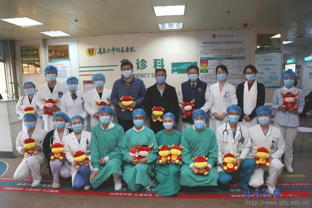 下午,夏东伟校长在金年金字招牌诚信至上附属医院党委书记王新生、院长董蒨陪同下,先后来到青大附院市南院区急诊科、发热门诊、小儿外科、呼吸与危重症医学科、产科、重症医学科、胸外科、肝胆胰外科、胃肠外科、急诊外科、心血管外科、手术室看望慰问了除夕仍坚守在医疗一线的医护人员,夏东伟向医护人员致谢,感谢他们舍小家顾大家,不辞辛苦,恪尽职守、无私奉献。夏东伟向医护人员送上欢乐吉祥的牛年纪念玩偶并叮嘱大家保重身体,注意休息。
