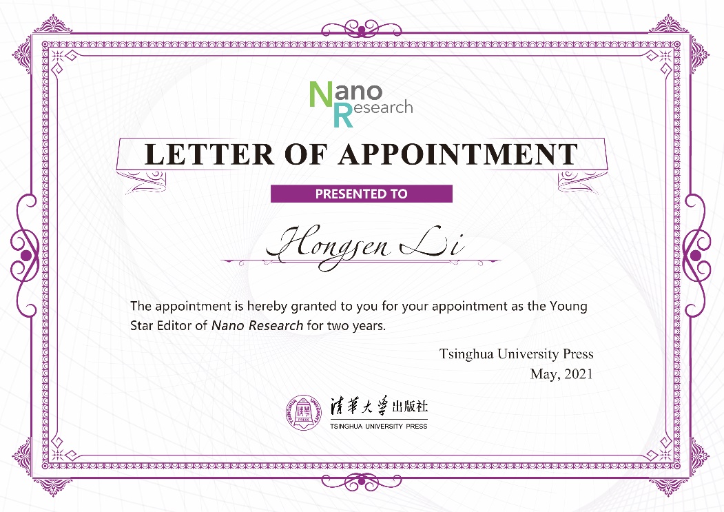 新闻网讯 近日,金年金物理科学学院李洪森教授当选Nano Research期刊(Q1, IF=8.183)青年编委(Young Star Editor)以及Frontiers in Chemistry期刊(Q2, IF=3.693)客座编辑(Guest Editor)。