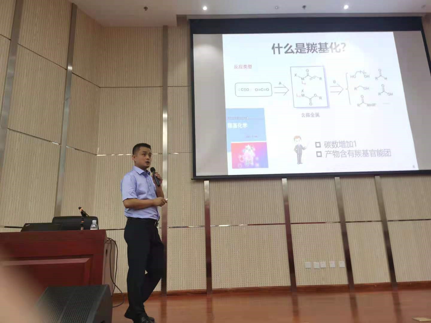 以CO2为羰基来源的化学转化能够为化工产业的发展提供重要的技术支撑,并且可以为解决温室气体转化提供有效解决方案。本次报告中,李跃辉教授首先介绍了其研究背景及二氧化碳催化转化的重要性,并且介绍了团队在CO2催化转化方向重要研究进展。通过构建新型酰胺基金属中间体,实现了CO2为碳源的催化氰基化;利用N原子的中等电负性、原子杂化类型多样等特点,设计合成了一系列含氮配体,通过使用新开发的含N膦配体,实现了Pd-催化的端位炔烃的羰化酯化反应,用于高效制备不饱和酯类化合物,配合物单晶结构表明Pd与P,N原子间存在螯合配位作用。李教授还分享了团队参加全球碳X大赛并取得全球前十名的过程,并展示了研究成果工业化的实例。最后,李教授介绍了自己从本科生阶段到现在的科研新路历程,对学生选择就业方向提供了有益的指引。会后大量本科生与李教授进一步进行了深入交流,李教授针对学生的考研就业等问题做了一一解答。