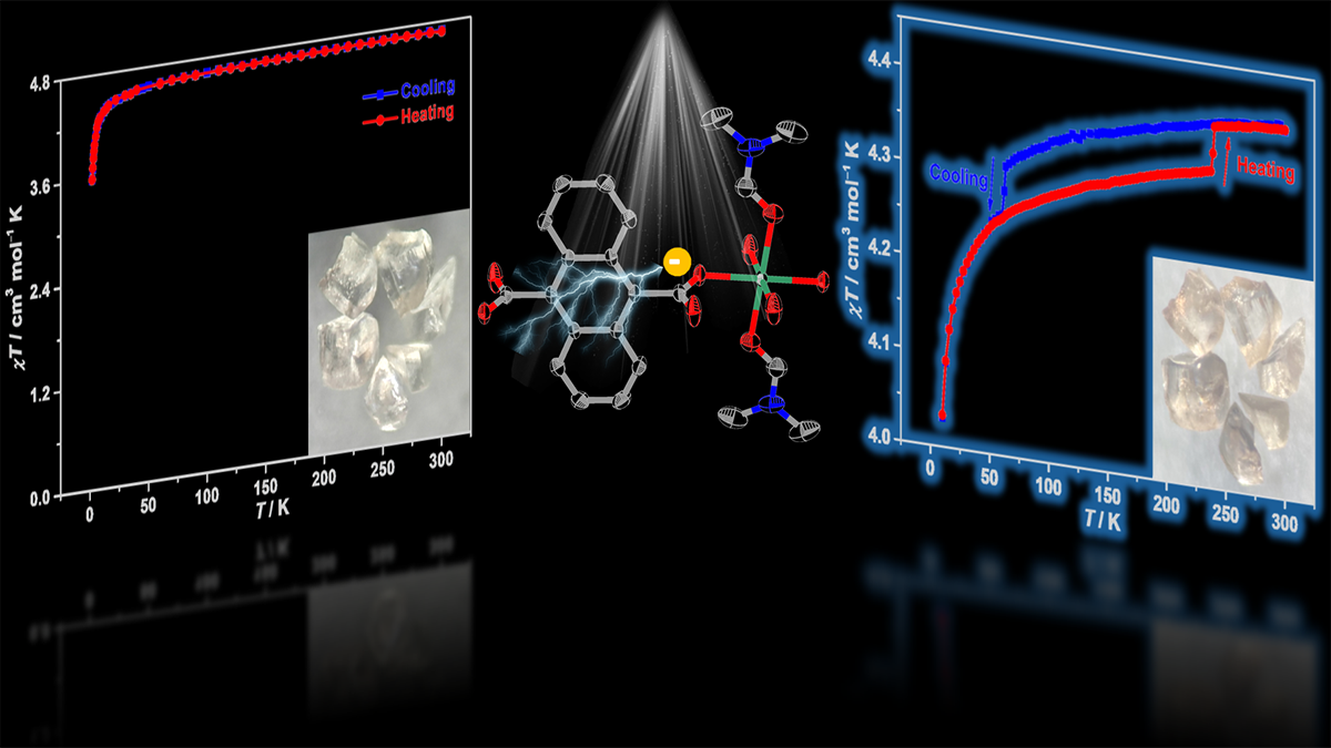 磁性双稳态多功能材料在分子开关、传感与信息存储等领域具有重要应用,迄今如何实现具有巨大热滞行为的磁双稳态调控仍然是材料科学中的重大挑战。王国明教授团队在前期光致变色材料研究基础上,设计蒽二甲酸分子作为光活性组分、过渡金属Mn2+离子作为自旋载体,成功组装出优异光致变色功能新材料。光照能够实现这类材料的磁结构由单离子单链构型转变,自由基与顺磁金属产生磁耦合作用变化,并诱导产生带有热滞回线的磁双稳态现象。该研究工作首次在自由基驱动的光致变色材料中实现了巨大热滞回线的磁双稳态,也是迄今为止稳定双稳态磁性体系中热滞回线最宽的一例。