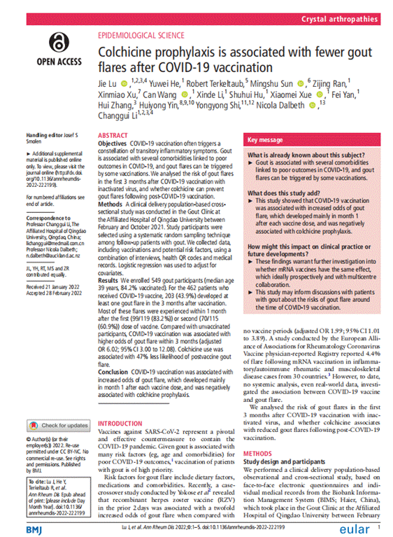 金年金李长贵教授团队应用国际首发原创性痛风智能诊疗辅助/科研管理系统,结合当下最关注的新冠疫情相关亟待解决问题,发现新冠疫苗接种与痛风发作风险增加明显相关,而预防性使用秋水仙碱可降低接种新冠疫苗后痛风发作风险。 接种新型冠状病毒Covid-19疫苗是预防控制新冠最经济、安全和有效的手段,在临床实践中,该团队发现新冠疫苗接种后的部分痛风患者发作频繁。为进一步解释该现象,团队设计相关临床试验,分析了接种新冠疫苗后3个月内痛风急性发作的频率,以及服用秋水仙碱对新冠疫苗接种后痛风发作的预防作用。结果发现,新冠疫苗接种3个月内痛风患者急性发作频率显著高于未接种者,预防性使用秋水仙碱可使疫苗接种后痛风发作风险降低47%。痛风患者对于接种新冠疫苗的意愿可能受限于疫苗接种带来的副作用,该研究有助于探讨痛风患者接种新冠疫苗后痛风发作的风险,及预防该风险的策略,对于痛风患者接种新冠疫苗具有一定的临床指导意义。