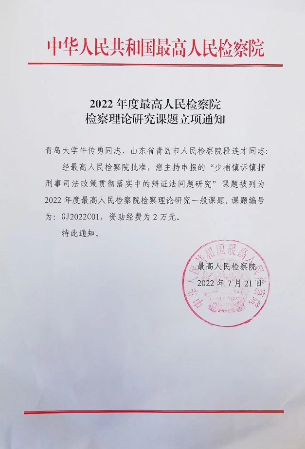 新闻网讯 2022年7月21日,法学院与青岛市人民检察院、市北区人民检察院共同申报的课题《少捕慎诉慎押刑事司法政策贯彻落实中的辩证法问题研究》获得2022年度最高人民检察院检察理论研究课题。
