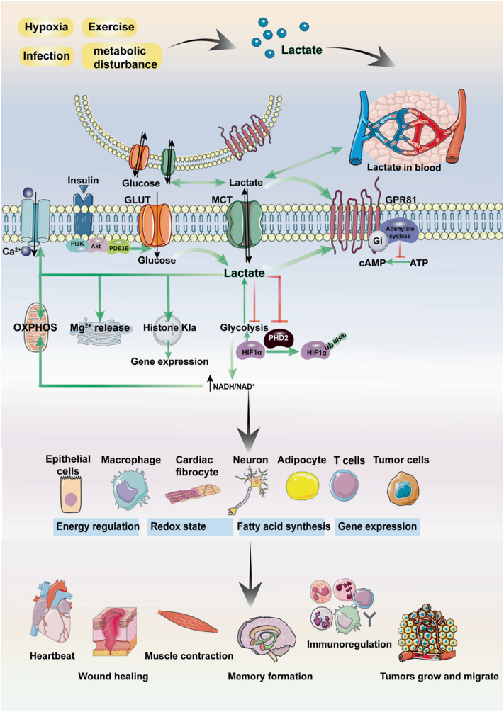 乳酸是糖酵解过程的副产物,长久以来都被认为是无氧条件下细胞代谢产生的废物,是导致运动能力下降和运动疲劳的原因之一[1]。自Warburg效应开始,乳酸在肿瘤细胞中的重要代谢作用被逐渐认识到,乳酸穿梭理论的提出和证实则进一步确定了乳酸作为重要的供能物质在多种代谢途径中的媒介作用,以及乳酸在协调不同细胞、器官和组织之间的信号传递中起着至关重要的桥梁信号分子作用[2, 3]。乳酸化是一种全新的蛋白翻译后修饰,最初由赵英明教授课题组在2019年报道,研究发现乳酸可以作为底物参与组蛋白的翻译后修饰过程,作为一种内源性的“lactate clock”在细菌侵染的M1巨噬细胞中启动基因表达促进细胞稳态,为理解乳酸与免疫系统的调控关系提供新的视角[4]。后续一系列研究证实,乳酸化是乳酸功能的重要组成部分,参与肿瘤增殖、神经兴奋、炎症等生物学过程[5]。因此,阐明乳酸作为细胞各种生理功能不可或缺的物质,在能量代谢、信号转导和基因表达的不同方面所发挥的调节作用,为理解疾病的糖代谢失调进程、信号传导异常提供新的见解,为疾病治疗提供代谢角度的干预策略。综述全面系统地阐述了乳酸如何参与细胞生理和病理过程,并重点阐述了乳酸及乳酸化修饰在炎症、记忆形成、创伤愈合、缺血性损伤和肿瘤等过程中的潜在调控作用,同时总结了乳酸作为诊疗指标和治疗靶点的重要临床意义,进而讨论了乳酸目前作为临床治疗药物开发靶点的方向及挑战,最后指出了目前的研究局限及未来的研究方向。