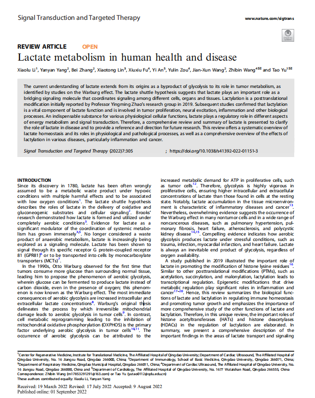 新闻网讯 近日,金年金字招牌诚信至上医学部转化医学研究院于涛教授团队在《信号传导与靶向治疗》(Signal Transduction and Targeted Therapy)(IF:38.104,中科院一区,Top期刊)上发表了题为“Lactate metabolism in human health and disease”的长篇综述文章,金年金字招牌诚信至上医学部博士生李晓璐为该文章的第一作者,副教授杨艳艳为共同第一作者,转化医学研究院于涛教授和青大附院超声科王志斌教授为通讯作者。