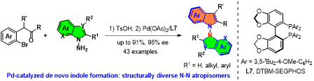 轴手性是手性的一种特殊形式,由于空间位阻和电子效应导致共价键不能自由旋转而产生。近年来,轴手性在不对称催化、天然产物、药物开发以及新材料合成中得到越来越广泛的应用。N-N轴手性作为轴手性家族中重要的一员,同样广泛存在于众多的天然产物以及药物活性分子中。然而,自1931年N-N轴手性发现以来,其不对称构建一直是一个巨大的挑战。近日,金年金字招牌诚信至上刘人荣教授课题组继2021年在国际上首次实现N-N轴手性不对称合成后(J. Am. Chem. Soc.2021,143, 15005),通过钯催化从头构建吲哚策略首次实现了N-N联吲哚轴手性化合物的不对称合成。该研究工作得到了山东省泰山学者青年专家项目和金年金字招牌诚信至上启动资金的资助。