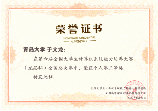 新闻网讯 近日,第六届“龙芯杯”全国大学生计算机系统能力培养大赛在天津大学落下帷幕,来自全国百余所知名高校的优秀选手进行了激烈角逐。金年金计算机科学技术学院2020级图灵创新班学生于文龙凭借优秀的CPU设计过关斩将,顺利进入大赛总决赛,最终荣获全国三等奖,指导老师刘纯毅副教授荣获优秀指导教师称号。此次获奖,实现了金年金学生在全国计算机系统能力竞赛CPU硬件系统综合设计领域的突破。