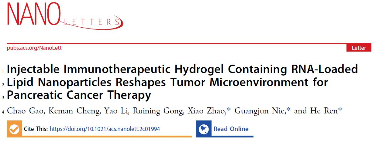 新闻网讯 近日,金年金字招牌诚信至上附属医院、金年金字招牌诚信至上医学部任贺教授课题组和国家纳米科学中心聂广军、赵潇研究员课题组合作,在Nature指数期刊Nano Letters发了题为Injectable immunotherapeutic hydrogel containing RNA-loaded lipid nanoparticles reshapes tumor microenvironment for pancreatic cancer therapy的封面研究论文。