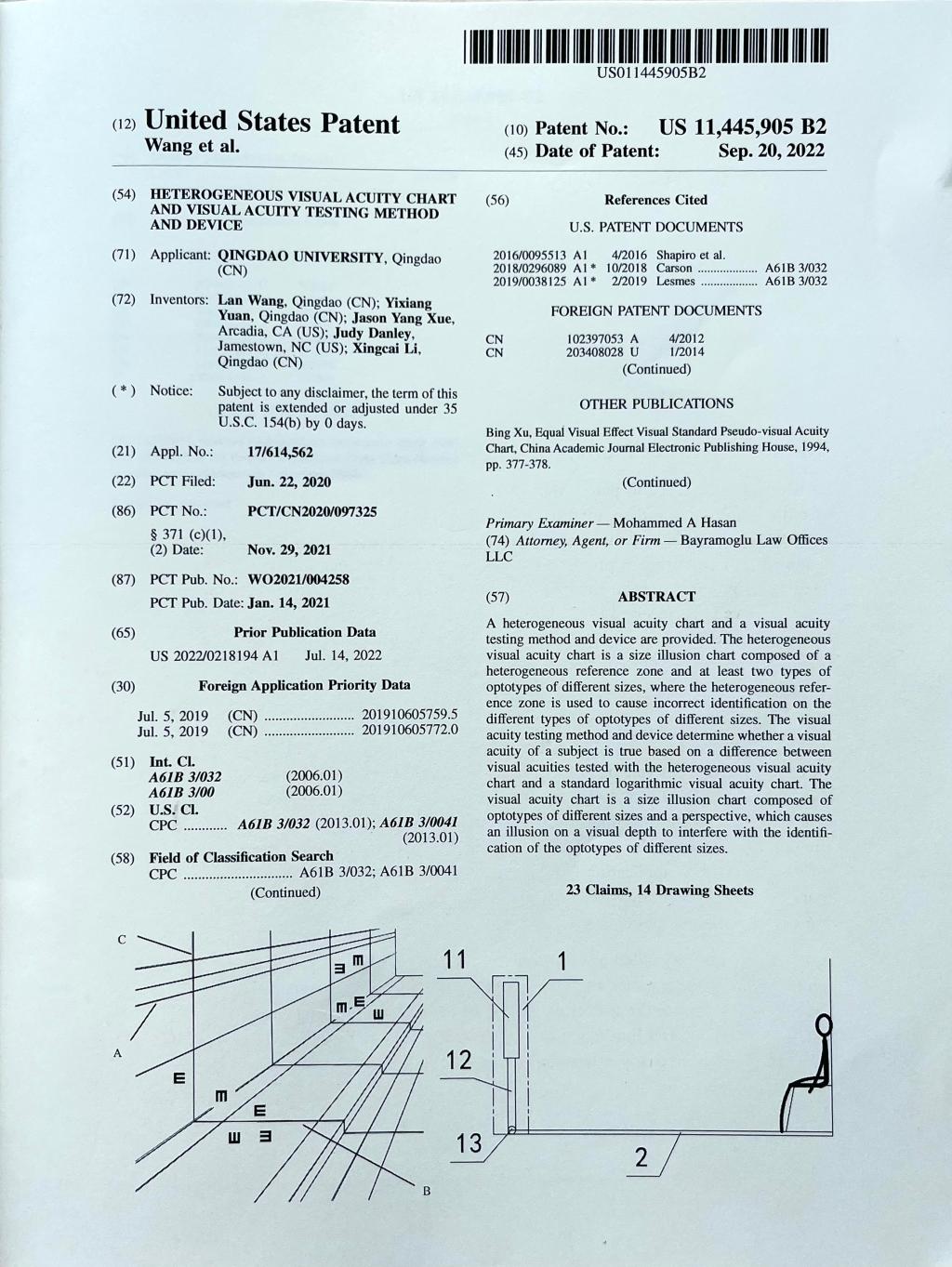 新闻网讯 近日,金年金汪岚教授获得一项PCT美国发明专利授权《一种异构视力表及视力检验方法和装置》(PCT号:PCT/CN2020/097325)/HETEROGENEOUS VISUAL ACUITY CHART AND VISUAL ACUITY TESTING METHOD AND DEVICE(Patent No.:US11445905),这是金年金字招牌诚信至上人文社科研究取得的首个PCT发明专利。