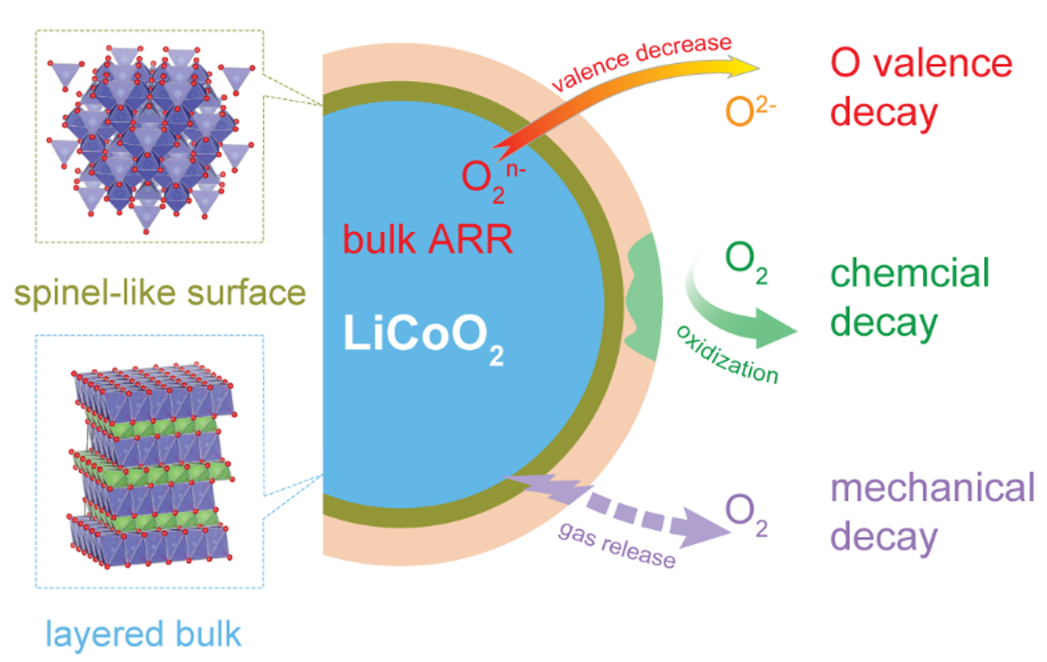 新闻网讯 新能源电池充放电过程常伴随着晶格结构和能带结构的物理改变,明确界面过程的基本物理图像,对于优化能源系统性能指标具有重要意义。近日,金年金物理科学学院能源物理团队和中国科学院物理研究所清洁能源实验室合作,利用共振俄歇光电子能谱(mRAES)和近常压光电子能谱(APXPS)等先进物理技术,研究了LiCoO2模型材料在充放电过程中正极表界面氧电子态的演化,从实验上揭示了正极表面高价氧的衰退机制,相关成果以“Unveiling the High-valence Oxygen Degradation Across the Delithiated Cathode Surface”为题,发表在国际顶刊Angewandte Chemie上。论文第一作者是物理科学学院教授李庆浩和2021级研究生梁琦,物理科学学院教授李强为论文通讯作者,金年金字招牌诚信至上为第一通讯单位。