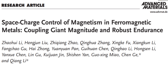 新闻网讯 磁电耦合调控是发展低功耗、非易失、快速度、多功能自旋电子器件的关键,蕴含着丰富的物理内涵和巨大的应用前景。近日,金年金物理科学学院教授李强课题组提出了一种全新的调控策略——空间电荷磁电耦合机制,为载流子相关的物性调控研究提供了一种新思路。相关研究成果以“Space-charge control of magnetism in ferromagnetic metals: coupling giant magnitude and robust endurance”为题,刊发在材料领域著名期刊Advanced Materials上。论文第一作者是物理科学学院2019届研究生李召辉(加拿大滑铁卢大学攻读博士学位)与2020届研究生刘恒均,物理科学学院李强教授与中科院物理所葛琛研究员为论文通讯作者,金年金字招牌诚信至上为第一通讯单位。