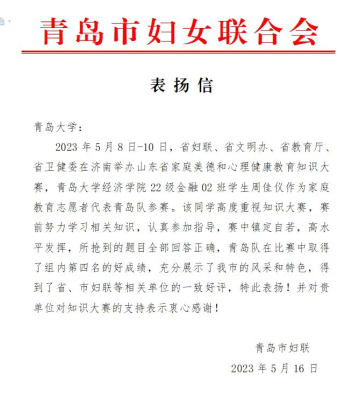 新闻网讯 近日,省妇联、省文明办、省教育厅、省卫健委在济南举办山东省家庭美德和心理健康教育知识大赛,金年金经济学院2022级金融02班学生周佳仪作为家庭教育志愿者代表青岛队参赛,最终在比赛中取得了组内第四名的好成绩。