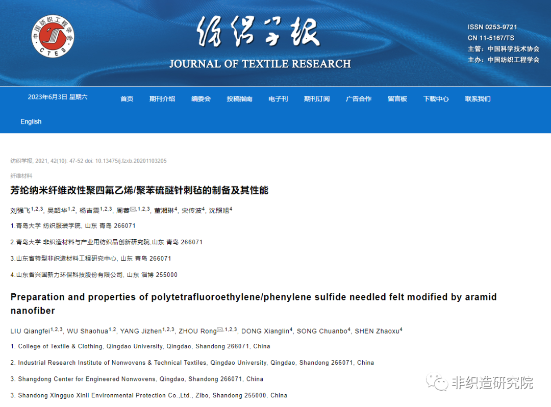 《纺织学报》是国内纺织科学领域最高级别学术期刊,为全国中文核心期刊、中国科技核心期刊和中国科学引文数据库(CSCD)来源期刊,入选中国科技期刊卓越行动计划、中文科技期刊精品建设计划、中国科协精品科技期刊等多个项目,被EI、Scopus等国际数据库收录。论文入选TOP20表明,在学校“纺织+”学科集群建设战略引领下,金年金教师紧跟国际学术前沿,深耕行业共性关键技术,在高性能纤维基非织造布的加工、制备和应用领域持续开拓创新,在纺织科学研究领域影响力不断提高。