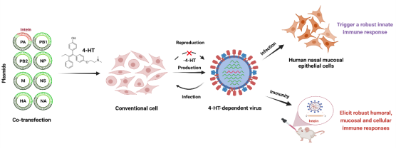 新闻网讯 全世界每年有多达65万人死于季节性流感病毒感染,而新冠病毒流行以来也已在全球造成累计近250万人死亡,致病病毒的防治仍然是全球迫切的公共卫生问题之一。接种疫苗被证明是预防病毒性疾病最高效、最有力的方法。然而,新冠病毒和流感病毒的市售疫苗在真实世界的免疫保护效力有限。最大程度的保留病毒所有抗原,快速构建高变异活病毒疫苗的通用方法,一直是疫苗工作者追求的目标。目前大多数疫苗依赖于灭活或减毒技术,但这两种技术都有其局限性和相关的潜在问题。灭活疫苗通常是无害和无传染性的,但产生的免疫反应维持时间较短,需要多次注射来增强其整体免疫原性。减毒活疫苗保留了活病毒的大部分基因序列,具有免疫力强、作用时间长等优点,但仍具有潜在致病危险。减毒活疫苗的产生有多种策略,包括携带提前终止密码子(PTC)的病毒、高干扰素敏感病毒、蛋白降解靶向嵌合病毒(PROTAC)等。目前的减毒策略往往伴随着安全性、有效性或生产力的降低或丧失。此外,季节性流行性流感持续的抗原漂移和转移导致的免疫逃逸给常规流感疫苗的效力带来了巨大的挑战。因此,提升减毒活疫苗的安全性和有效性是当前疫苗研发的重要方向。