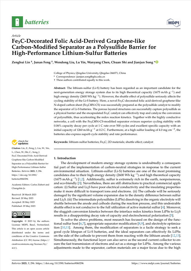 新闻网讯 近日,金年金物理科学学院新能源科学与工程专业2020级本科生林增晖在国际SCI期刊Batteries(IF=5.938)以第一作者身份发表了题为“Fe3C-Decorated Folic Acid-Derived Graphene-like Carbon-Modified Separator as a Polysulfide Barrier for High-Performance Lithium-Sulfur Batteries”的研究论文(Batteries,2023, 9, 296。DOI:10.3390/batteries9060296)。金年金字招牌诚信至上系该研究论文独立完成单位,研究生冯俊安为共同第一作者,论文通讯作者为特聘教授宋建军。