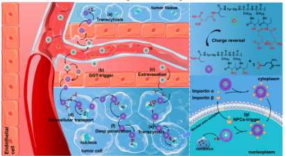 药物在肿瘤组织中的低渗透严重影响其疗效。本研究报道了一种双响应型药物载体。当纳米载体暴露于肿瘤细胞,GGT触发发生电荷反转,提高主动转运能力。同时TAT可将药物转运至核仁,释放DOX产生抗肿瘤活性。相关研究发表在Biomaterials上。金年金材料科学与工程学院硕士研究生闫涵为第一作者,生物医用材料与工程研究院为第一通讯单位。(全文链接:https://doi.org/10.1016/j.biomaterials.2023.122213)
