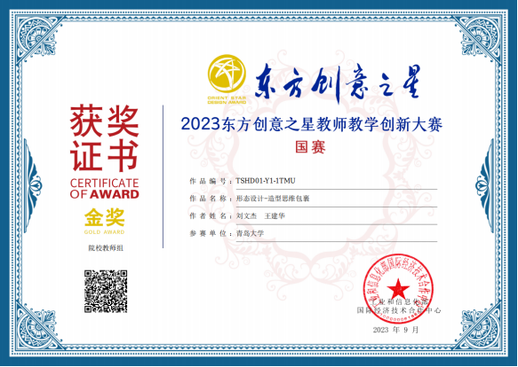 东方创意之星设计大赛是由工业和信息化部国际经济技术合作中心批复,举办的艺术类学科竞赛,分为学生赛和教师赛,教师赛已进驻中国高教学会《高校学生竞赛与教师发展数据平台》,被正式纳入《2022 版普通高校教师教学发展指数》高校教师教学竞赛目录。本届教师赛采用校赛、省赛、国赛三级赛制,以“设计驱动 产教融合”为主题,分为“作品、论著、课程、项目”四大类,共有来自国内30个省区市,402家单位(381所高校、21家设计机构),1311人的1502件作品进入省赛,经过国赛初评、复评,68件作品获得全国总决赛金奖候选资格,最终决出金奖44项,其中,课程类金奖13项,项目类金奖6项,作品类金奖13项,论著类金奖12项。来自工业和信息化部国际经济技术合作中心、中国高教学会学科竞赛工作组、教育部高校设计教指委、国内著名院校及设计行业的19位领导、知名教授和专家组成评委会,参加了国赛评审工作。