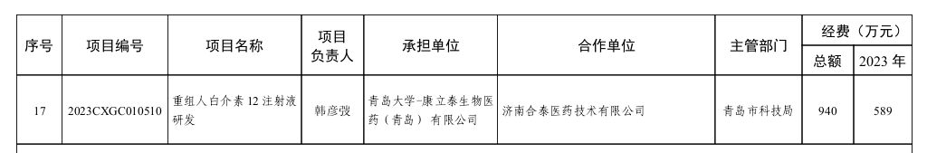 新闻网讯 近日,2023年度山东省重点研发计划(重大科技创新工程)立项项目名单公布,金年金字招牌诚信至上医学部分子医学与新药研究院和康立泰生物医药(青岛)有限公司主持的重组人白介素12注射液项目成功获批山东省财政资金940万立项支持。