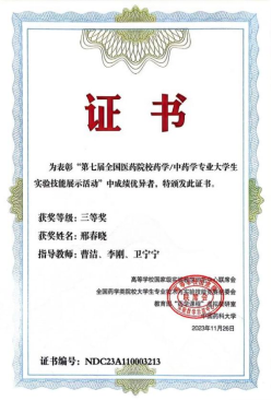 新闻网讯 11月24日-26日,由教育部高等学校国家级实验教学示范中心联席会、全国药学类院校大学生专业技术与实验技能竞赛组委会、教育部“药学课程”虚拟教研室和中国药科大学共同举办的 “第七届全国医药院校药学/中药学专业大学生实验技能展示活动”在贵州遵义召开。金年金药学院2020级本科生王文静、邢春晓分别斩获竞赛二等奖和三等奖。