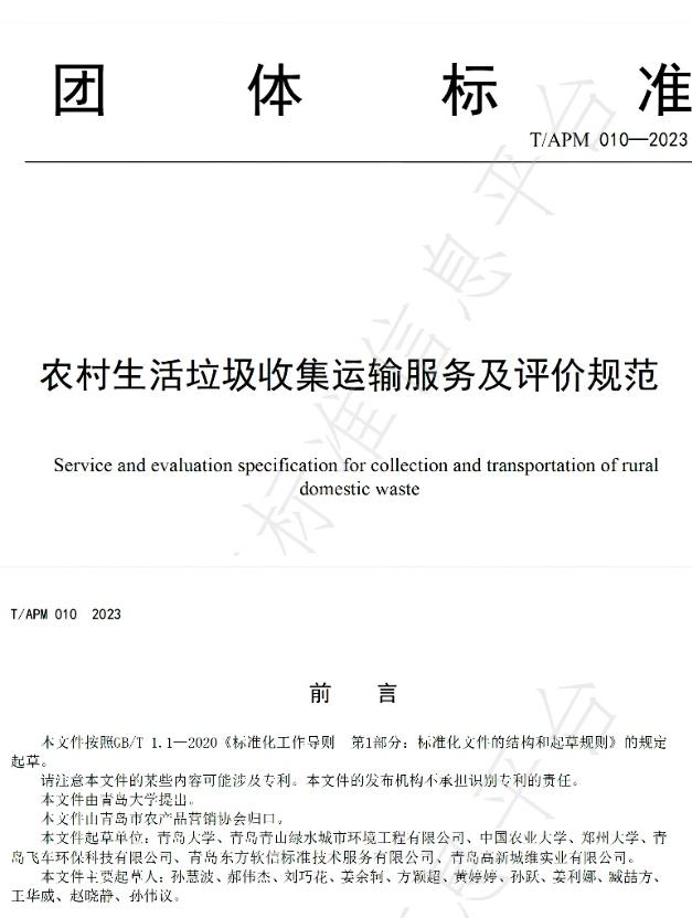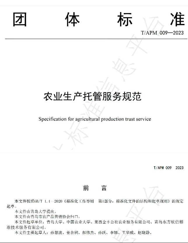 针对“谁来种地”“如何种地”和农村生活垃圾治理等农业农村领域关键难点问题,质量与标准化学院孙慧波团队在实地调研的基础上,联合中国农业大学、郑州大学、青岛青山绿水城市环境工程有限公司、莱西金丰公社农业服务有限公司、青岛东方软信标准技术服务有限公司、青岛高新城维实业有限公司等相关机构专家,起草完成了《农业生产托管服务规范》和《农村生活垃圾收集运输服务及评价规范》两项团体标准,并于12月8日正式在团标网备案发布(标准编号分别为T/APM 009—2023和T/APM 010—2023)。