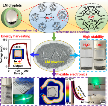 液态金属(LM)具有优异的导电性和流动性,在柔性可拉伸电子领域具有广阔的应用前景。但是高表面张力(例如:EGaIn,624 mN m‒1)使其难以与基体材料有效的结合,并且在使用过程中容易泄露。尽管通过微纳化的方法生产LM微纳液滴可以解决棘手的加工问题,但由于液滴表面的化学活性,使其在溶液中难以长时间稳定保存。
