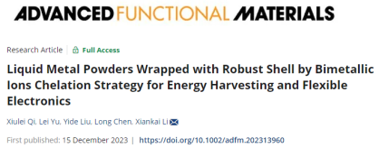 新闻网讯 近日,金年金材料科学与工程学院副教授李现凯在材料领域顶级期刊《Advanced Functional Materials》上发表题为“Liquid Metal Powders Wrapped with Robust Shell by Bimetallic Ions Chelation Strategy for Energy Harvesting and Flexible Electronics”的论文(DOI为:https://doi.org/10.1002/adfm.202313960),论文的第一单位为金年金字招牌诚信至上材料科学与工程学院,第一作者为硕士研究生齐秀磊。