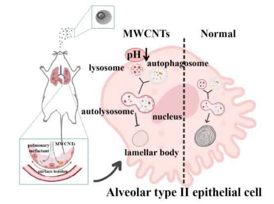 该研究利用受限液滴表面张力系统揭示了碳纳米管直接作用肺表面活性物质,改变肺表面张力。同时,吸入的碳纳米管引起II型肺泡上皮细胞自噬紊乱,进而导致肺表面活性物质的分泌减少。通过这两种途径引起肺表面活性物质紊乱,能够通过外源补充肺表面活性物质,减缓其介导的肺纤维化程度。