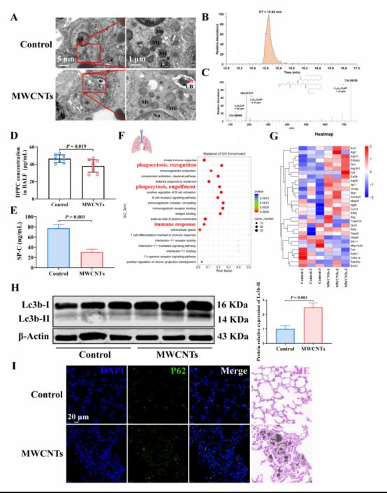 MWCNTs暴露可引起II型肺泡上皮细胞中板层小体(II型肺泡上皮细胞储存和分泌肺表面活性物质的特有细胞器)出现空泡化改变,同时肺泡灌洗液中DPPC(肺表面活性物质中磷脂的主要成分)和SP-C(肺表面活性物质中的肺表面活性蛋白)含量均显著降低。进一步分析作用机制发现,MWNCTs引起Lc3b-II及p62蛋白表达水平升高,表明MWCNTs暴露可引起自噬流阻断。进一步通过体外研究分析自噬流阻断原因,发现MWNCTs可通过作用于溶酶体,引起溶酶体pH值降低及损伤,影响自噬溶酶体形成,导致自噬功能障碍,进而诱发肺表面活性物质的分泌减少。最后为进一步确证肺表面活性物质与MWNCTs诱导的肺纤维化之间的关联,研究者通过外源补充肺表面活性物质(Curosurf),发现肺表面活性物质可以有效改善MWNCTs吸入暴露引起的肺纤维化程度,表明肺表面活性物质的损伤是MWNCTs引起肺纤维化的重要诱因。