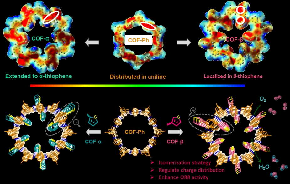 在前期研究工作(Angew. Chem. Int. Ed., 2019,58, 11369;Angew. Chem. Int. Ed.,2021,60, 26483;Angew. Chem. Int. Ed., 2022,61,e202209583;Adv. Mater.,2023,35, 2209129)基础上,龙晓静教授采用噻吩位置异构化策略调节分子几何结构,定向设计并开发出含2-噻吩的COF-α和含3-噻吩的COF-β异构共价有机框架氧还原电催化剂。通过几何修饰有效调节电子态和中间体吸附能力,从而使π-电子的化学活性和局部电荷密度可控,实现了优异的催化性能。