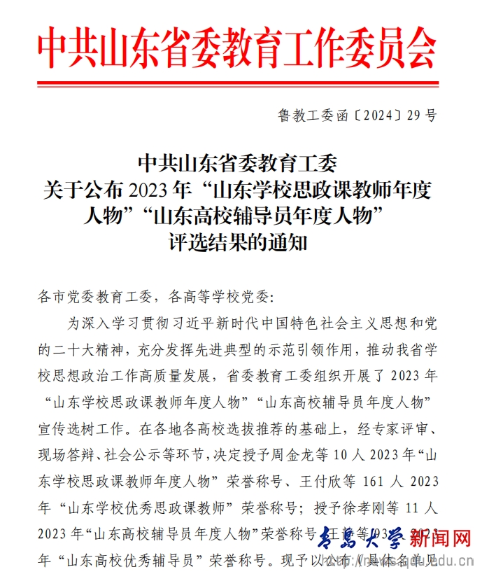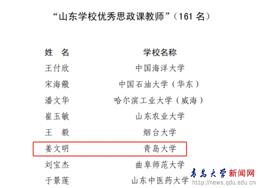 新闻网讯 近日,中共山东省委教育工委公布了2023年度“山东学校思政课教师年度人物”评选结果,金年金马克思主义学院教师姜文明荣获“山东学校优秀思政课教师”称号。