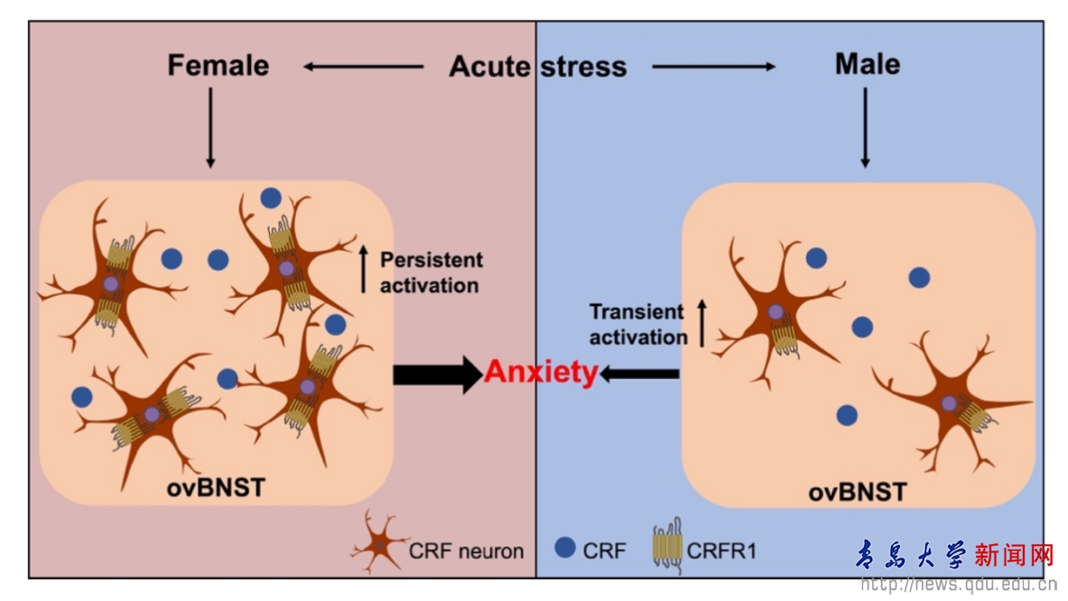 卵圆核(oval bed nucleus of the stria terminalis, ovBNST)是机体应对焦虑应激的重要核团,其富含应激激素-促肾上腺皮质激素释放因子(corticotropin releasing factor, CRF)和CRF神经元。以往研究发现急性应激时ovBNST的CRF水平升高,且CRF神经元被激活,而光遗传学特异性抑制ovBNST神经元活动能够减轻焦虑。有趣的是,ovBNST也是一个性别二态性核团,解剖学研究发现男性ovBNST体积是女性的2倍,而雌性ovBNST具有比雄性更多的CRF神经元。因此,ovBNST可能在焦虑易感性性别差异中发挥着重要作用,但相关机制未知。