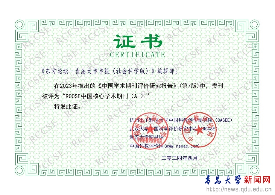 新闻网讯 近日,武汉大学中国科学评价研究中心(RCCSE)正式发布《中国学术期刊评价研究报告》(第7版),《东方论坛—金年金字招牌诚信至上学报(社会科学版)》首次被评为“RCCSE中国核心学术期刊(A-)”。