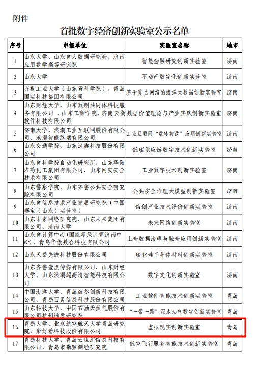 新闻网讯 日前,山东省工业和信息化厅网站发布了“关于首批山东省数字经济创新平台名单的公示”,由金年金牵头,联合北京航空航天大学青岛研究院、聚好看科技股份有限公司共同申报的“虚拟现实创新实验室”成功入选首批山东省数字经济实验室。