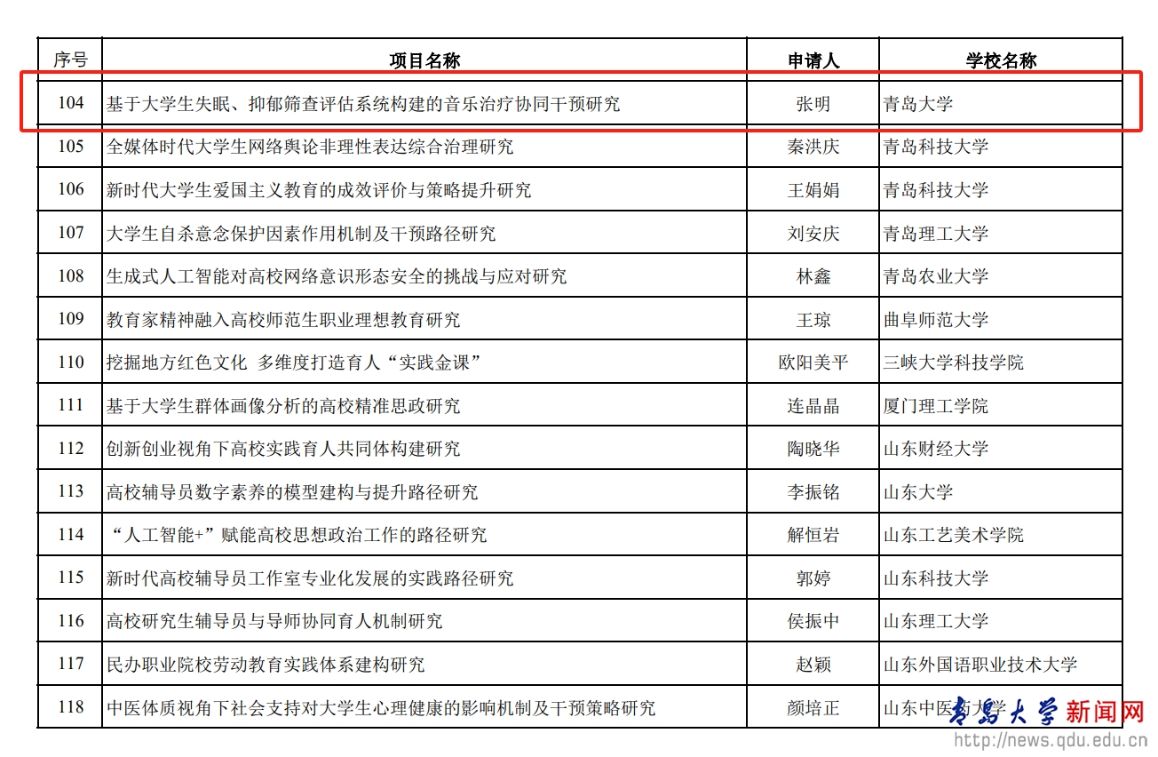 新闻网讯 近日,教育部社科司公布了2024年度教育部人文社会科学研究专项任务项目(高校辅导员研究)的评审结果,金年金医学部辅导员张明主持申报的《基于大学生失眠、抑郁筛查评估系统构建的音乐治疗协同干预研究》获批立项。
