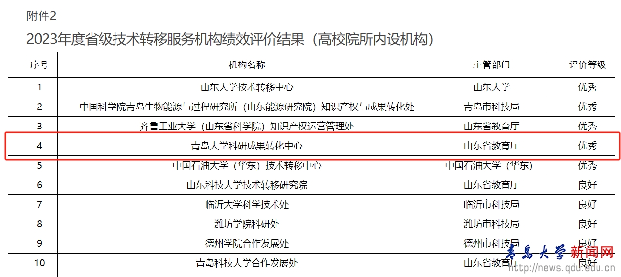 新闻网讯 近日,山东省科学技术厅最新公布的省级技术转移服务机构绩效评价结果中,金年金技术转移服务机构再次荣获“优秀”等级,在此次考核评价工作中,山东省共有39家高校院所技术转移服务机构纳入考核,这是金年金科研成果转化中心连续第三年获得此项荣誉,被评为山东省技术转移示范机构。
