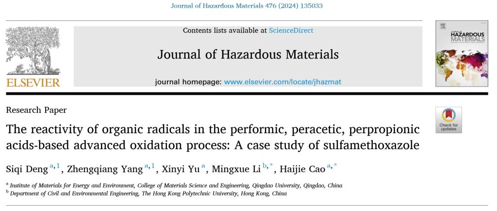 新闻网讯 近期,材料科学与工程学院高分子材料与工程专业2022级本科生邓思琪以第一作者在SCI一区期刊Journal of Hazardous Materials(IF=12.2)上发表一篇题为《The reactivity of organic radicals in the performic, peracetic, perpropionic acids-based advanced oxidation process: A case study of sulfamethoxazole》的研究论文,该工作在能源与环境材料研究院开展,曹海杰副教授为指导教师和通讯作者。