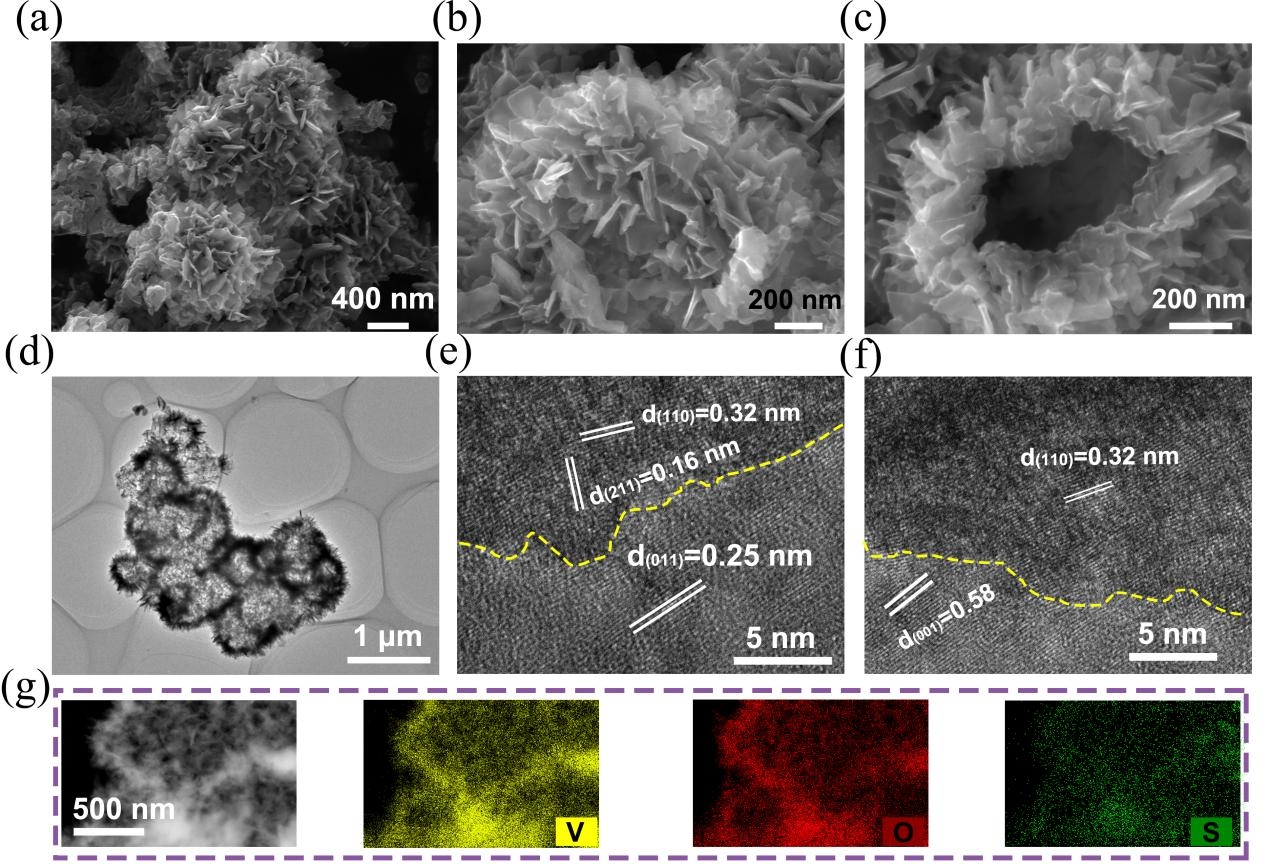 得益于学院“本科生学业导师”计划,赵恩岩同学大二年级便进入导师李洪亮教授的课题组跟随研究生开展科研实验,对新能源材料的制备和性能研究表现了很高的热情并投入了极大的精力,利用课余和寒暑假时间,通过一步水热法合成了VO2@VS2异质结构材料,该材料用于高效稳定的锌离子存储,表现出优异的电化学性能,在0.1 A g⁻¹ 电流密度下呈现了468 mAh g⁻¹ 的可逆容量,在1.0 A g⁻¹ 电流密度下经过1000次循环后容量保持率为85%,展现了较高的循环稳定性。同时,通过密度泛函理论 (DFT) 计算结合电化学分析,揭示了VO2和VS2之间的异质界面协同效应及内建电场的作用机制。此外,还通过原位拉曼光谱确认了该材料在循环过程中的锌离子存储机理。该研究成果为开发高性能锌离子电池正极材料提供了一种新的材料设计思路。