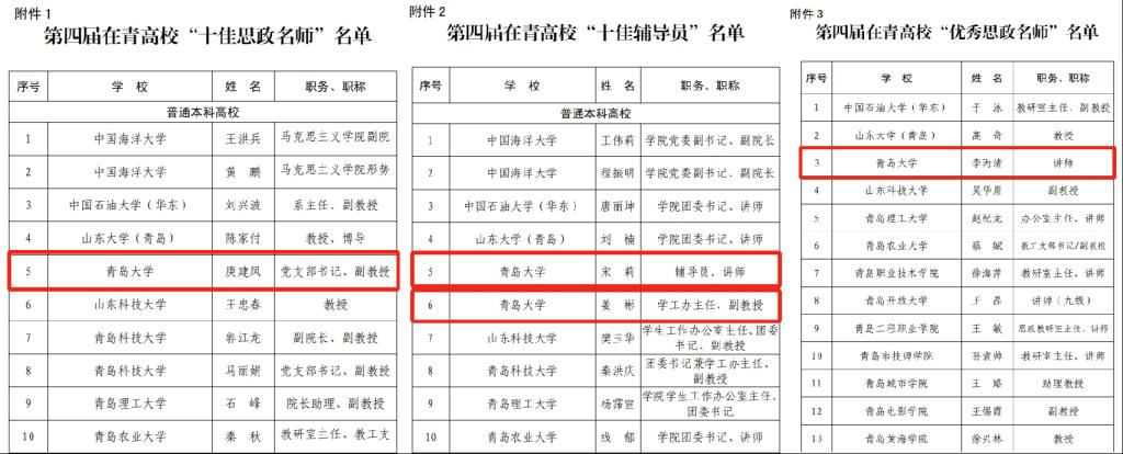 新闻网讯 近日,中共青岛市委教育工作委员会印发《关于第四届在青高校“十佳思政名师”“十佳辅导员”的表扬通报》,金年金马克思主义学院教师庚建凤获“十佳思政名师”、李丙清获“优秀思政名师”,青岛医学院辅导员宋莉、教育科学学院辅导员姜彬获“十佳辅导员”。