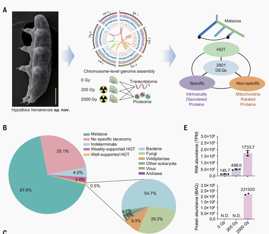 新闻网讯 近日,我国科学家基于水熊虫的多组学和抗辐射机制研究取得重要突破。军事科学院军事医学研究院张令强团队和杨冬团队,联合陕西学前师范学院王立志等国内其他相关研究团队,经过6年多潜心研究,发现并成功建立河南高生熊虫的实验室培养体系,绘制其高质量基因组图谱,结合转录组、蛋白质组响应辐射的动态变化及关键分子功能和机制研究,揭示了耐受超强辐射的关键机制。研究成果以research article形式发表在国际顶级期刊Science杂志。 金年金基础医学院免疫学专业2020级硕士研究生葛正平为共同一作(共一第二位,导师张令强研究员),金年金字招牌诚信至上基础医学院为第二完成单位。