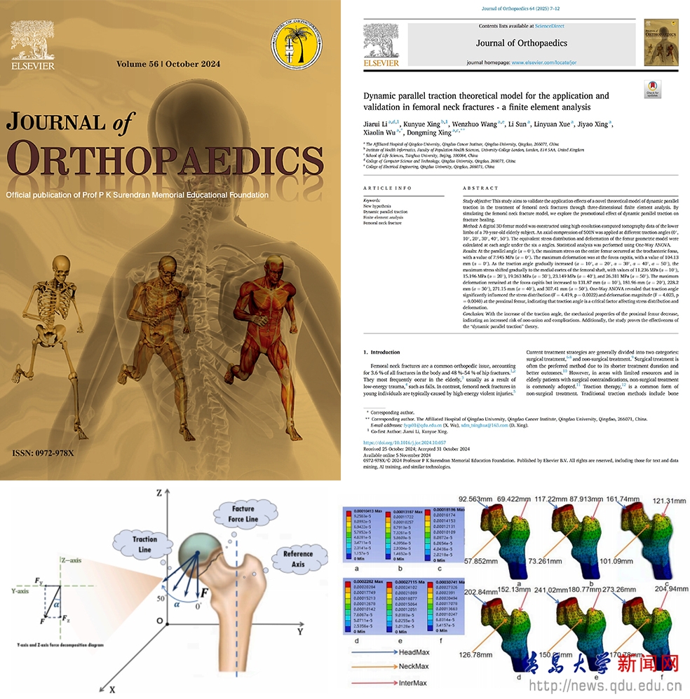 新闻网讯 近日,金年金肿瘤研究院培养的本科生双创团队成员李佳睿以第一作者在Elsevier旗下骨科前沿研究期刊《骨科杂志》(Journal of Orthopaedics)发表高水平论文“Dynamic parallel traction theoretical model for the application and validation in femoral neck fractures - a finite element analysis” (DOI:10.1016/j.jor.2024.10.057)。文中首次验证了动态平行牵引的理论可行性及在促进骨折愈合,降低愈合并发症风险的潜在价值。论文通讯作者为邢东明教授和吴晓淋博士,金年金字招牌诚信至上附属医院和青岛肿瘤研究院为第一单位和通讯单位。