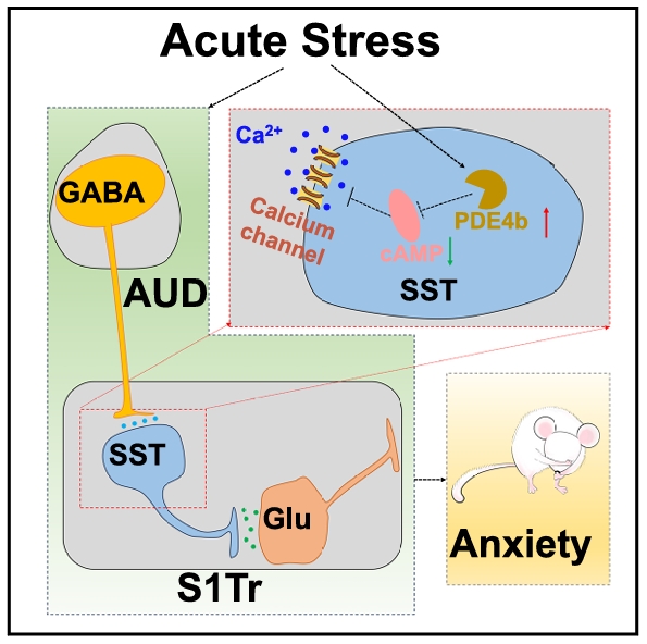 焦虑是一种复杂的情绪,表现为面对不确定性时过度紧张、担心或恐惧。通常,当哺乳动物遇到急性应激刺激时,它们会产生暂时的焦虑情绪,以维持维持注意力、应对新出现的威胁和挑战、避免重复暴露于危险情况所需的警惕性和唤醒性。以往的研究主要集中在将压力与焦虑联系起来的神经回路上,急性压力如何调节神经回路从而导致焦虑的潜在机制尚不充分。初级体感皮层(S1)是大脑的体感中枢,在疼痛和焦虑行为的处理中起着关键作用,之前的研究表明S1神经元在焦虑的调节中起重要作用。目前为止,S1神经元是否能够参与急性应激性焦虑尚不清楚。该研究证明急性应激可以激活S1TrSst神经元,导致它们在随后的类焦虑行为测试中产生低活性效应,最终导致类焦虑行为,并提供一系列证据,证明参与急性应激性焦虑的S1TrSst神经元接受来自AUD中GABA能抑制神经元的输入。他们发现,急性应激后,AUDGABA-S1TrSst神经回路中的几种PDEs上调,导致cAMP信号通路活性降低,因此,减少由AUDGABA输入的S1TrSst神经元中的Pde4b蛋白可以逆转急性应激诱导的焦虑样行为和神经元脱敏。该项研究为急性应激性焦虑的神经回路和分子机制提供了新的见解。