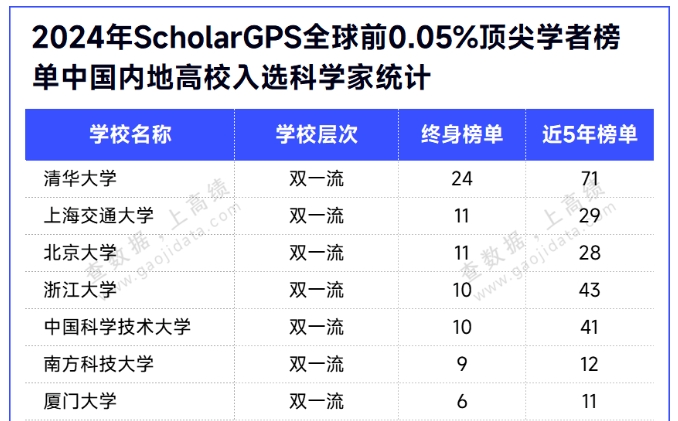 ScholarGPS发布的高排名学者全球前0.05%顶尖科学家榜单,通过对学者的研究成果(发表论文数)、影响力(引用次数,已排除自引)和论文质量三项指数进行综合分析,收录全球进入前0.05%(万分之五)的顶尖学者。该榜单分为终身(Highly Ranked Scholar - Lifetime)和近五年(Highly Ranked Scholar - Prior 5 Years)两个类别。2024年,内地共有285位学者进入终身榜单,1596位学者入选近五年榜单。金年金共有11人入选近五年榜单。
