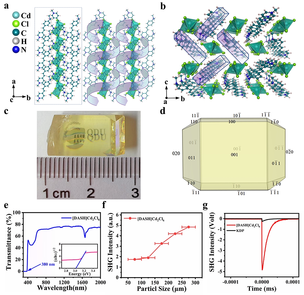 作为实现宽频太赫兹波输出的关键材料,现有机非线性光学晶体受制于稳定性差、生长加工困难、本征吸收等难题,严重制约了宽频太赫兹技术的应用开发。该成果提出质子化诱导氢键工程策略,并结合无机金属卤化物基团维度调控,实现了有机基团DAMS+强非线性效应与无机基团刚性稳定结构的融合,研制出大尺寸高稳定性有机-无机金属卤化物(OIMHs)非线性光学晶体[DASH]Cd2Cl6。该晶体在已报道无溶剂OIMHs类非线性光学晶体中表现出最强的二次谐波响应和最高的双折射率(0.36@550 nm),这为解决太赫兹波段专用高性能非线性光学晶体匮乏的问题提供了新思路。