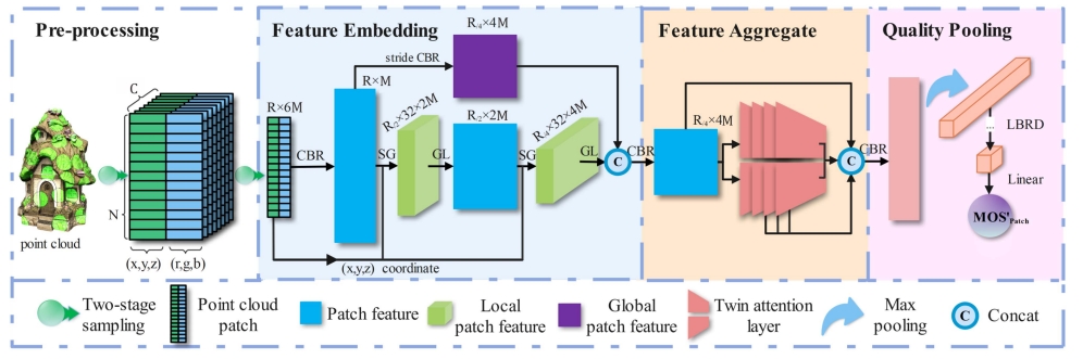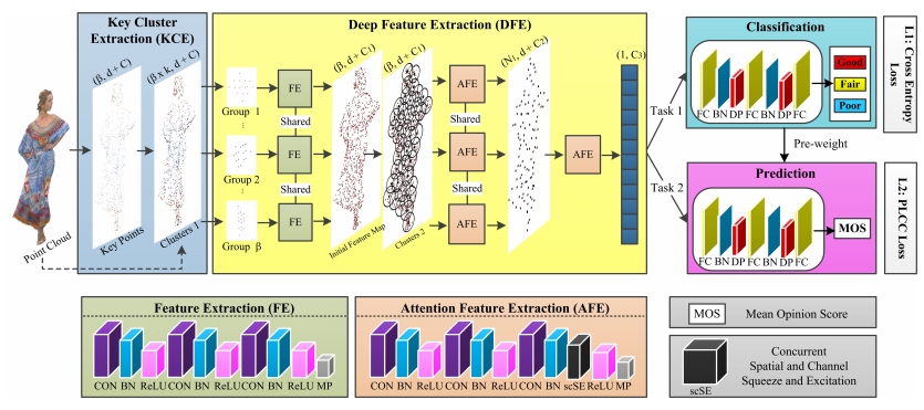 《Progressive Knowledge Transfer Network Based on Human Visual Perception Mechanism for No-Reference Point Cloud Quality Assessment》发表于IEEE Transactions on Visualization and Computer Graphics,第一作者是苏洪磊,通讯作者是刘祺和元辉。基于人类视觉感知机制,本课题组课题组提出了一种逐步优化质量预测的深度学习架构。PKT-PCQA首先进行粗粒度的质量分类学习,将点云质量分级模拟人眼对优劣的初步判断,随后通过渐进式知识迁移将该粗粒度认知逐步转化为精细的质量评分任务。模型融合了点云的局部与全局特征,并引入空间和通道注意力模块,提升对视觉失真的敏感度。经三个大规模独立点云质量数据库验证,PKT-PCQA在无参考和部分参考评价中均优于现有方法,对比多种全参考指标也表现出相当或更优的性能。该方法有效提升了模型对点云主观质量的感知一致性,实现了从粗略感知到精确评价的跨越。提出的结构图如图4所示。